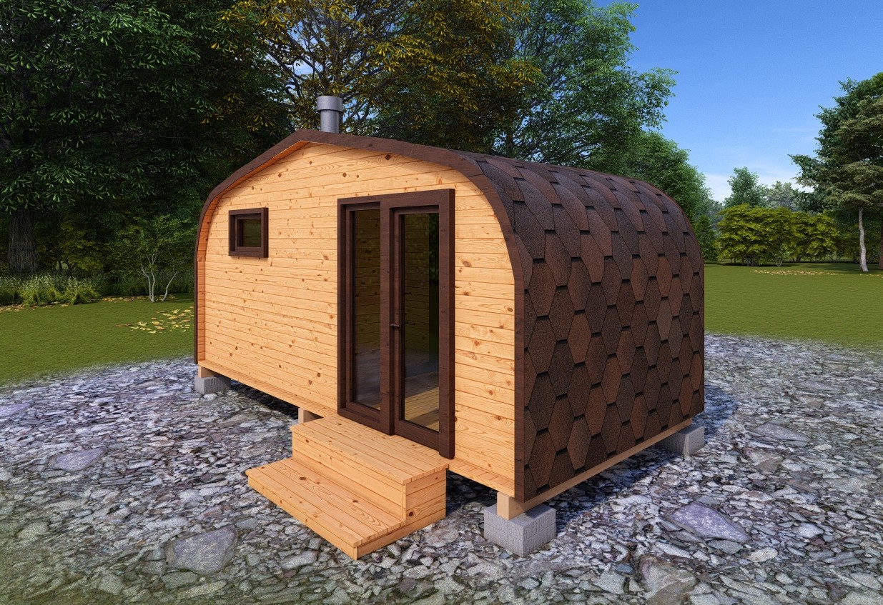 Баня-бочка «Пентагон» с панорамным окном Стильная и современная баня-бочка может быть выполнена длиною от 4 метров, с двумя отделениями (парилка и комната отдыха). Полок может быть, как с двух сторон, так и угловой, в стандарте двухуровневый. Печь в данной модели расположена сбоку с топкой внутрь парилки, либо наружу или в соседнее помещение. Печь можно укомплектовать баком для воды, а саму баню сделать длиною до 6 метров, комфортно разместив в ней дополнительно помывочную. Панорамное окно на входе добавит света и уюта в раздевалке. Установив баню в живописном месте, во время процедур можно наслаждаться видами из окна. В эту модель включено одно закаленное квадратное стекло в комнате отдыха. Обращаем Ваше внимание, по умолчанию в данной модели отсутствует бак для воды, вместо него идёт утеплённая термо-труба, которую можно заменить на бак по желанию.