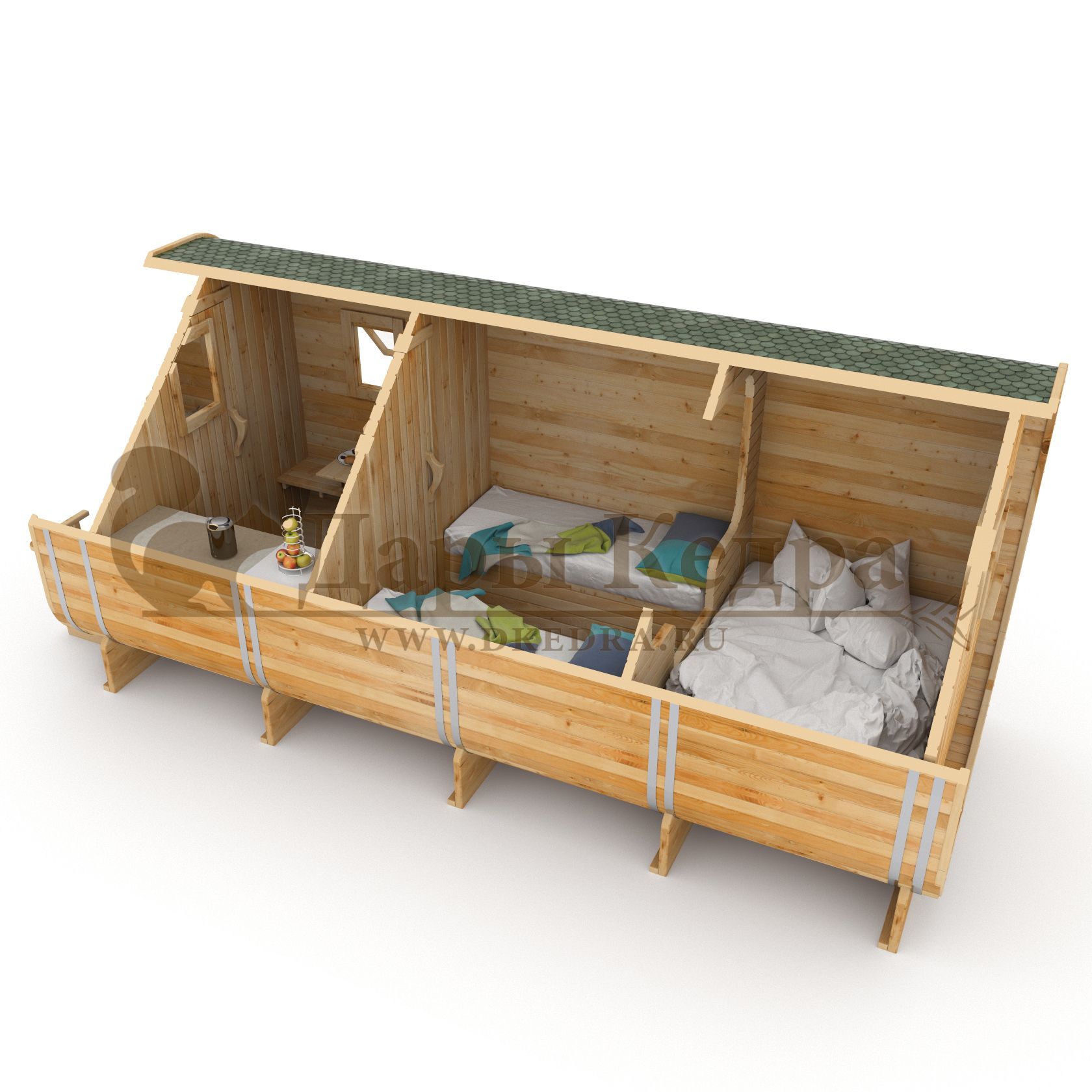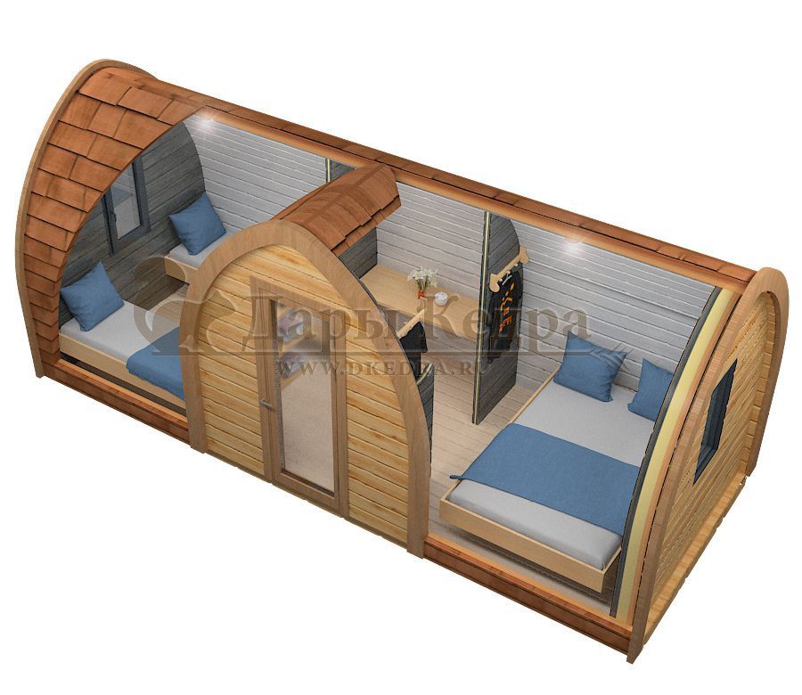 Кемпинг дом «Дуэт+» с боковым входом Такой кемпинг дом удобное и практичное решение для дачного использования или обустройства загородных баз отдыха. Увеличенные размеры и боковой вход со стеклянной дверью позволяют зонировать внутреннее пространство помещения. Домик включает в себя: Жилую зону с кроватями, столиком, вешалкой и полкой; Санузел с сантехникой, душевой поддоном и душевую стойку; Кемпинг дом изготовлен из хвойных пород древесины. Кровля из мягкой черепицы обеспечивают защиту от осадков.
